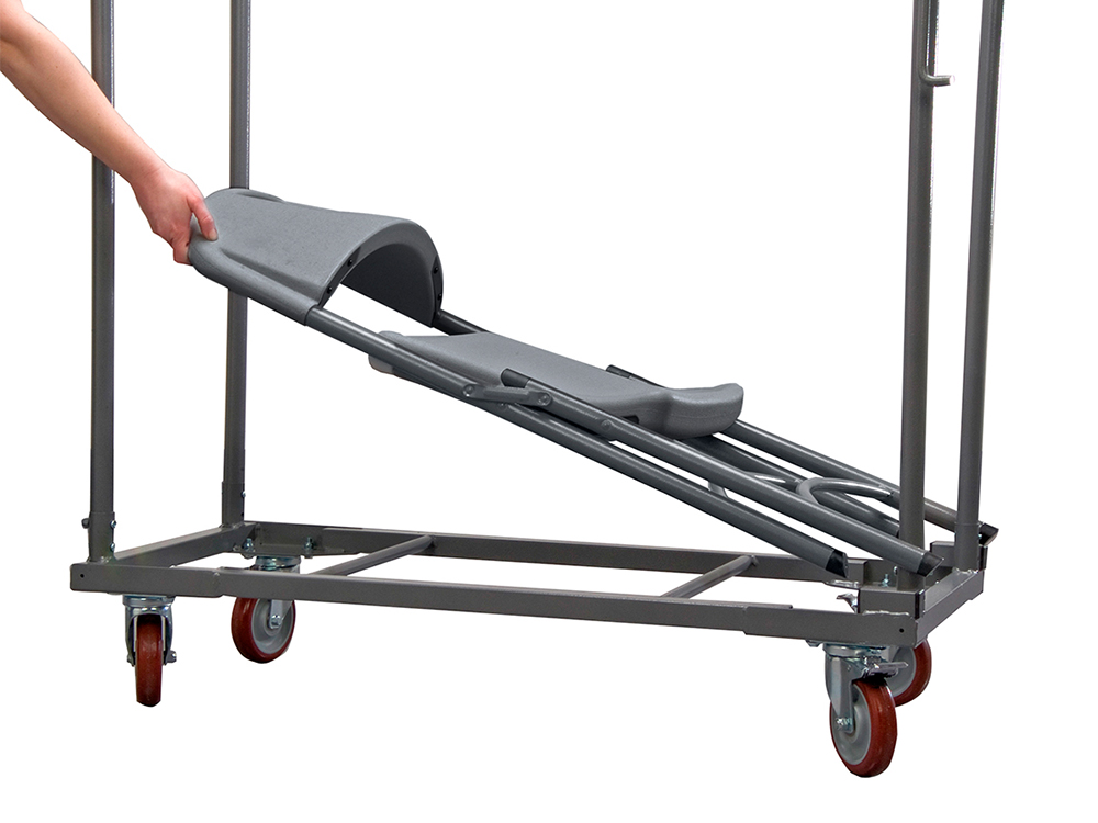 Grâce à son design intelligent, le chariot est accessible de tous les côtés, ce qui permet de charger et décharger les chaises pliantes rapidement et sans effort. Les montants verticaux assurent un maintien parfait des chaises empilées, avec un système de verrouillage et de déverrouillage facile.