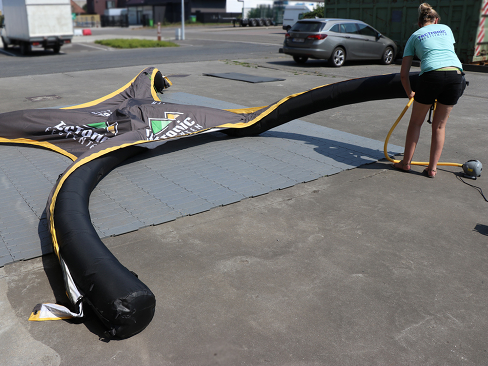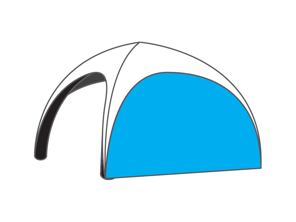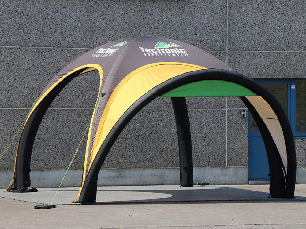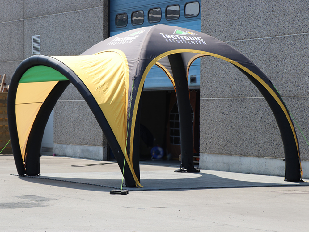 Comment monter la tente ? Vous branchez la pompe électrique à travers une vanne de gonflage par poteau et vous soufflez. Environ 5 minutes plus tard, votre tente en forme de dôme est debout. Bref, une mise en œuvre rapide. Le moteur peut être rangé car la tente n’a plus besoin d’être alimentée en air en permanence et restera bien gonflée pendant au moins (!) 30 jours. Et grâce à la protection contre la surpression, vous êtes assuré que votre tente publicitaire n’explose pas pendant son gonflage.