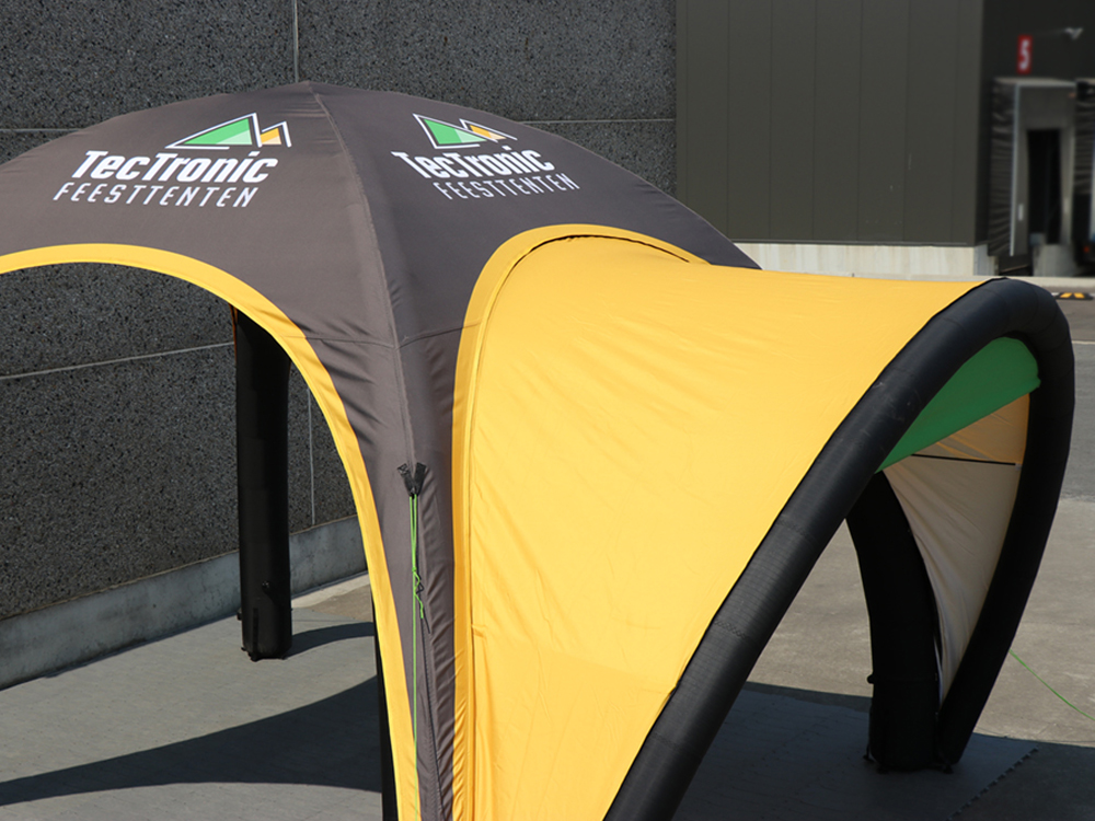 Le design et l’impression couleur par sublimation sont inclus dans le prix, tout comme l’armature, la bâche de toit personnalisée, les sacs de lestage et le sac de transport. Ce qui est optionnel, ce sont la pompe électrique, les parois latérales, l’auvent gonflable et les connecteurs qui permettent de relier plusieurs tentes ensemble. Cette tente gonflable est également disponible dans les dimensions suivantes : 3x3, 4x4, 5x5, 6x6, 7x7 ou 8x8 mètres.
