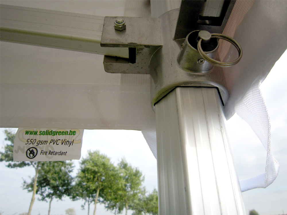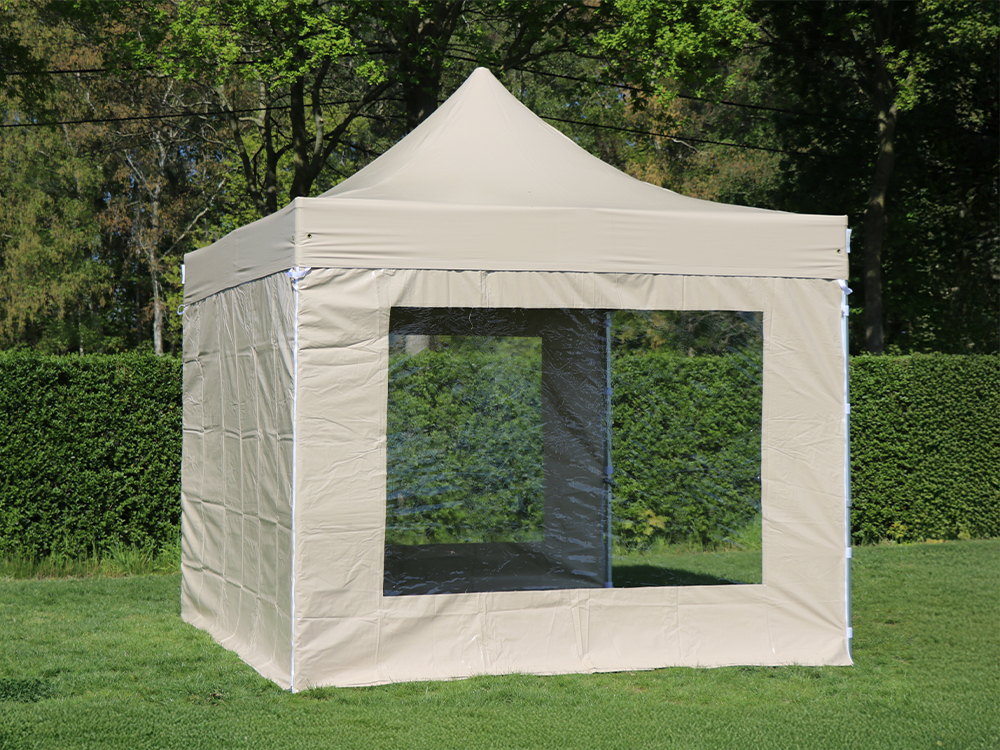Pour le barnum pliable en pvc la bâche de toit et les faces latérales sont à chaque fois fabriquées en pvc blanc ou beige de 550 gr/m² (à comparer avec une bâche de votre remorque), avec fonctionnement ignifuge. Ceci présente comme avantages que votre tonnelle pliable est non seulement étanche à l'eau et au vent, mais est aussi facile à nettoyer et extra durable. Moyennant un bon ancrage, vous pourriez laisser votre tente harmonica en pvc pour de plus longues périodes à l'extérieur, même en hiver. La tonnelle repliable de 3x3 est fournie avec 4 faces latérales ; 2 parois latérales avec une grande fenêtre, 1 paroi complètement opaque et 1 paroi avec une porte enroulable.